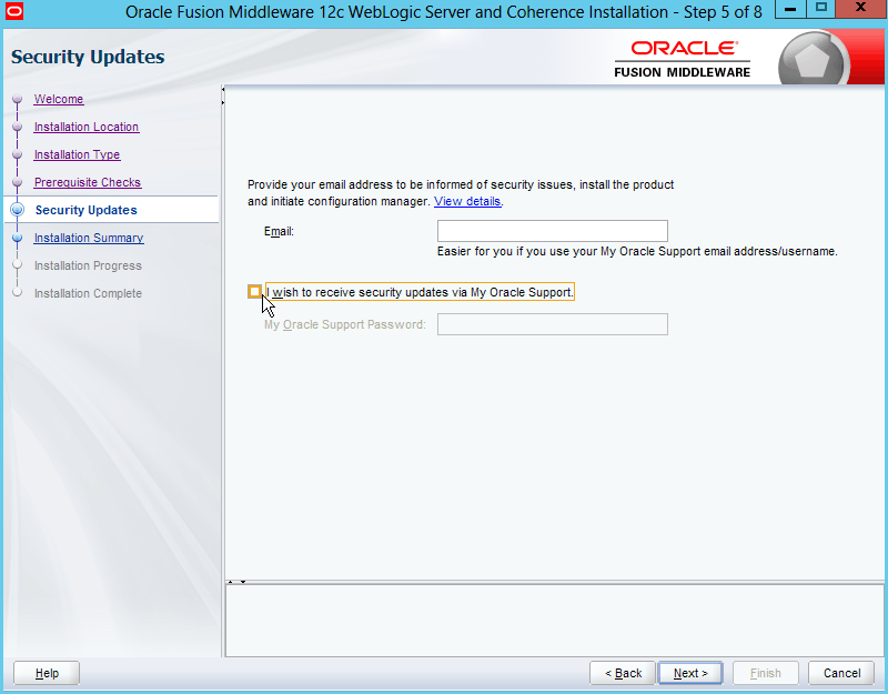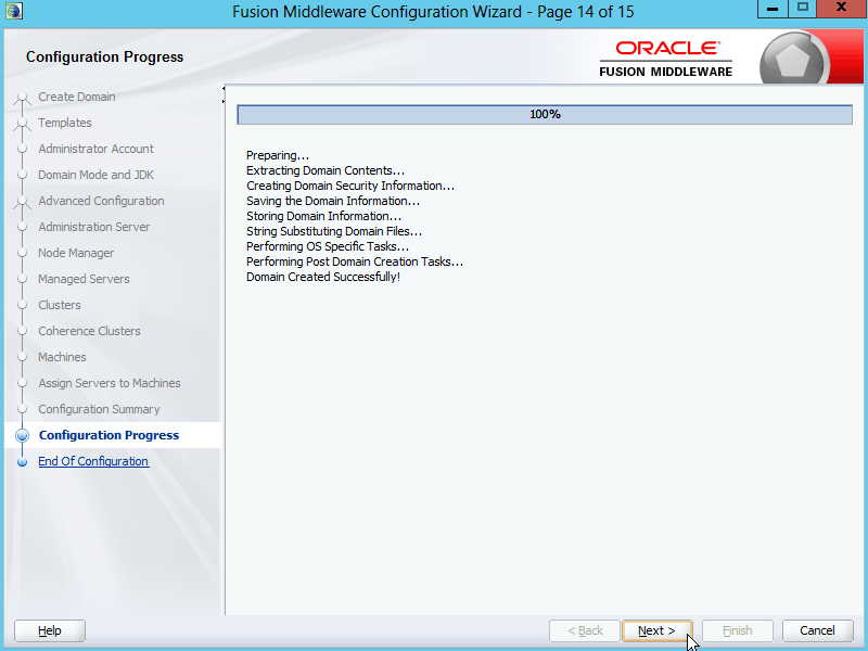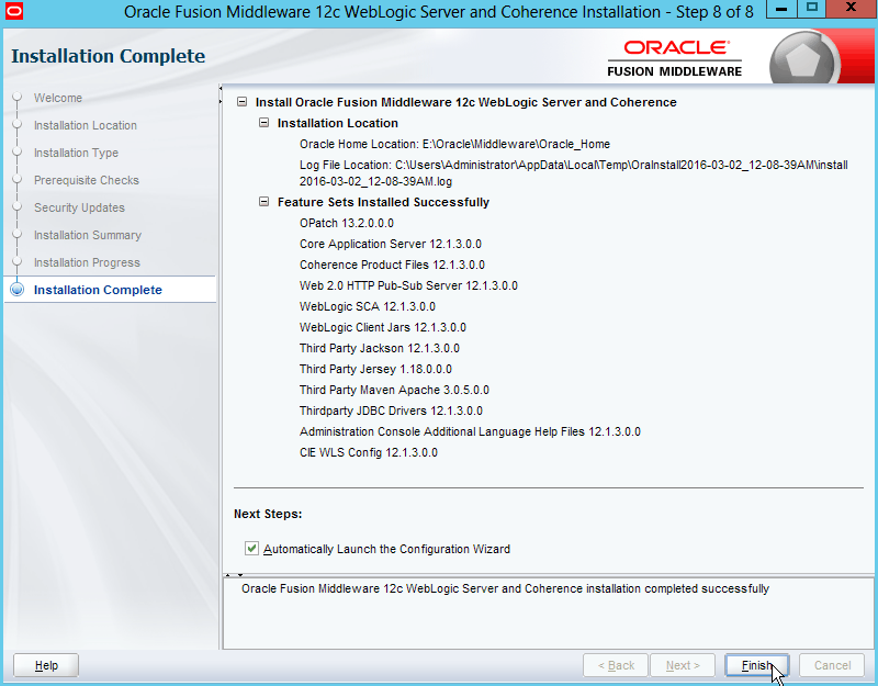 Fig. 018 If details are all available to proceed with the Weblogic Domain configuration, leave the option "Automatically Launch the Configuration Wizard", otherwise uncheck this option and launch the configuration wizard via a script later. Click Finish