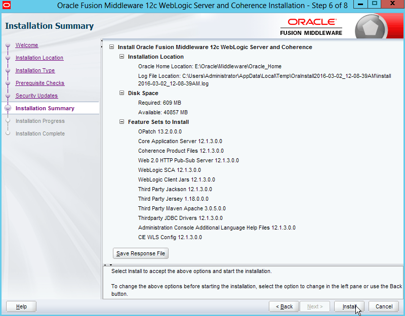 Fig. 001 Installers located in C:\installer. We have installer for java and weblogic (from Fusion Middleware 12.1.3). Weblogic will be installed on drive E: