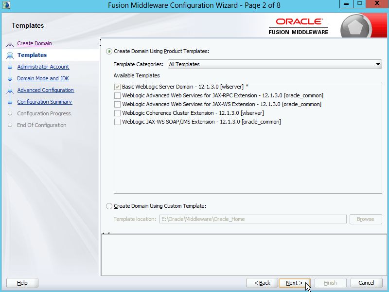 Fig. 021 Select "Create Domain Using Product Templates" and chose "Basic WebLogic Server Domain"