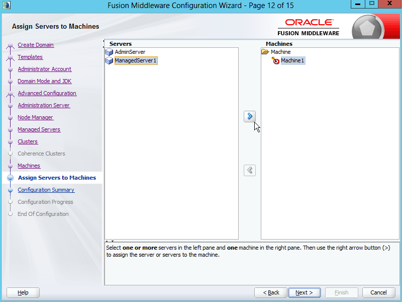 Fig. 033 In the Servers box, select ManagedServer1 and click the arrow button [>] to assign it to the machine Machine1