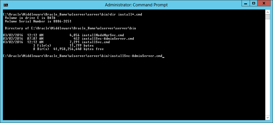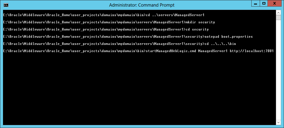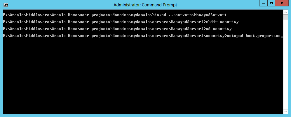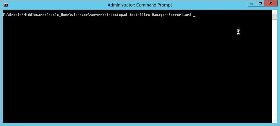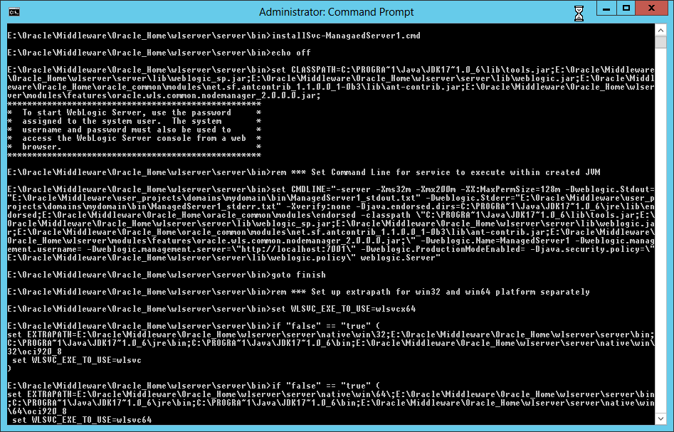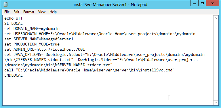 Fig. 068 Go to E:\oracle\middleware\oracle_home\wlserver\server\bin and create a master script to create the Managed1 server as a windows service. This script will define the environment variables for that will be used when calling the generic installSvc.cmdto create the managed server named Managed1 as a windows service.