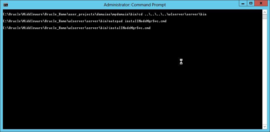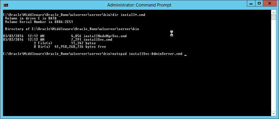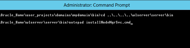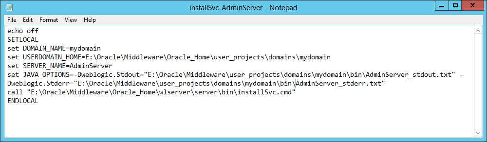 Fig. 062 Go to E:\oracle\middleware\oracle_home\wlserver\server\bin which is equivalent to %ORACLE_HOME%\wlserver\server\bin and notice there are 2 scripts provided by the installation ie. installNodeMgrSvc.cmd and installSvc.cmd. We will create a master script with our AdminServer details defined in environment variables and then call the generic installSvc.cmd script to create a windows service for our Administration server named AdminServer. In our example we use notepad to create this script and name it as installSvc-AdminServer.cmd