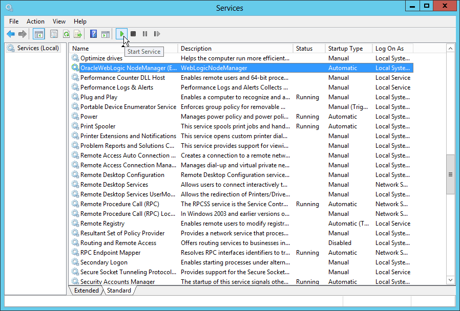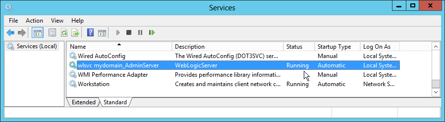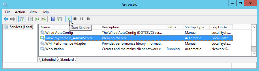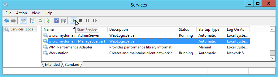 Fig. 066 Open the windows Services management console and find the newly created service named wlsvc mydomain_AdminServer. Click the Start Service button to start the service