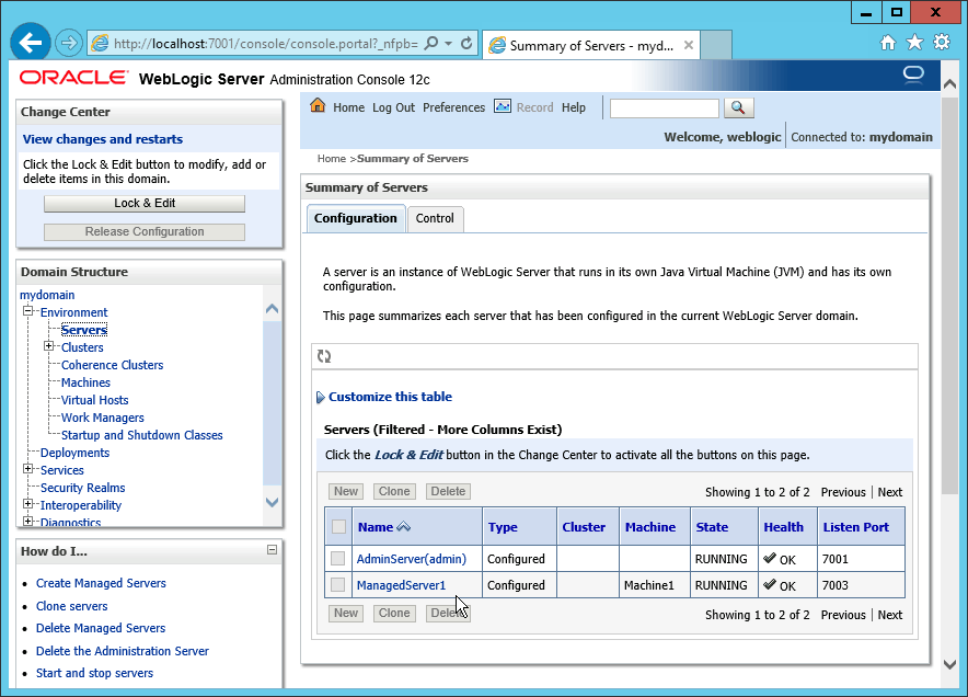 Fig. 073 Click the Servers menu to list the Admin and managed server instances. They should all be in RUNNING state