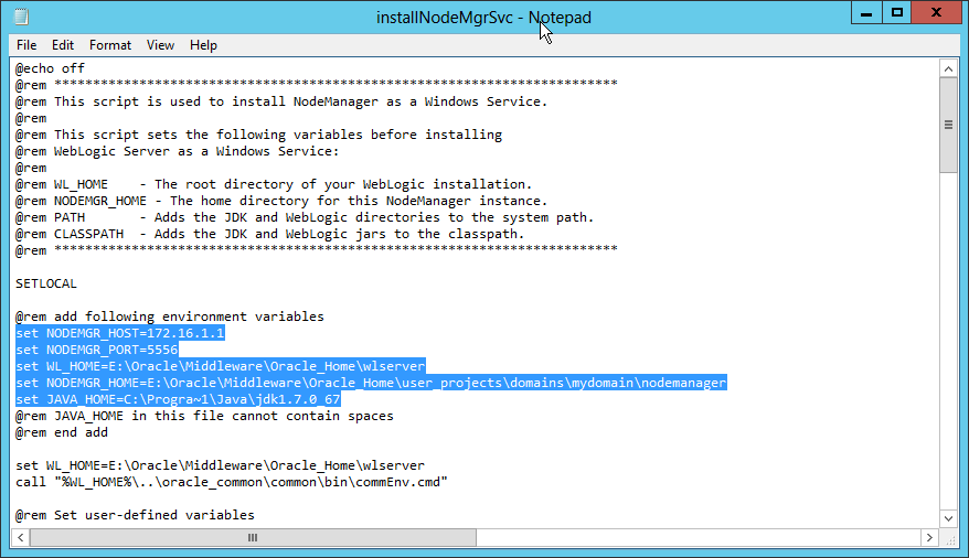 Fig. 092 At the top section of the script, define the values for NODEMGR_HOST, NODEMGR_PORT, WL_HOME, NODEMGR_HOME, JAVA_HOME. It was found that the JAVA_HOME value should not contain spaces, not even when enclosed within double quotes "". e.g. for C:\Program Files\Java\jdk1.7.0.67 shorten Program Files as Progra~1