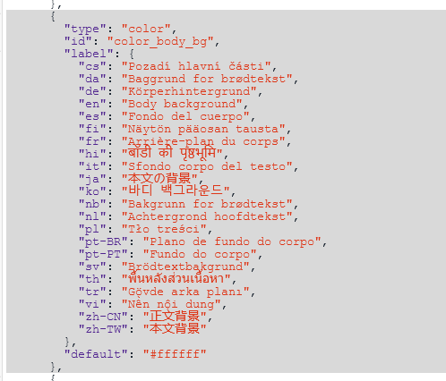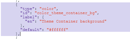 Since the new option is of theme type color, we find one existing option such as color_body_bg and copy the whole block from opening { to to closing } and including the comma ,